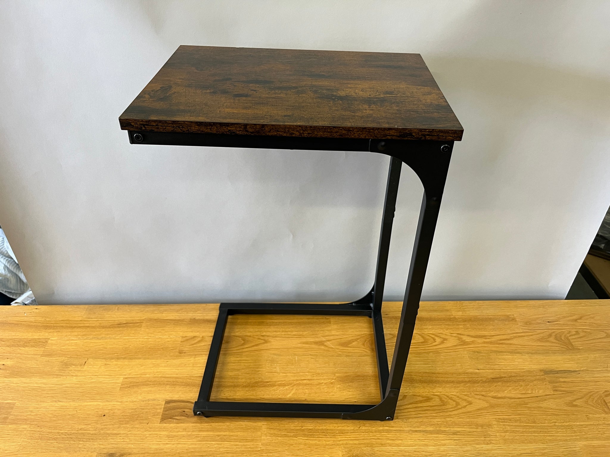 Square wood side / end table with metal legs. Height 24.5", Width 16", Depth 12"