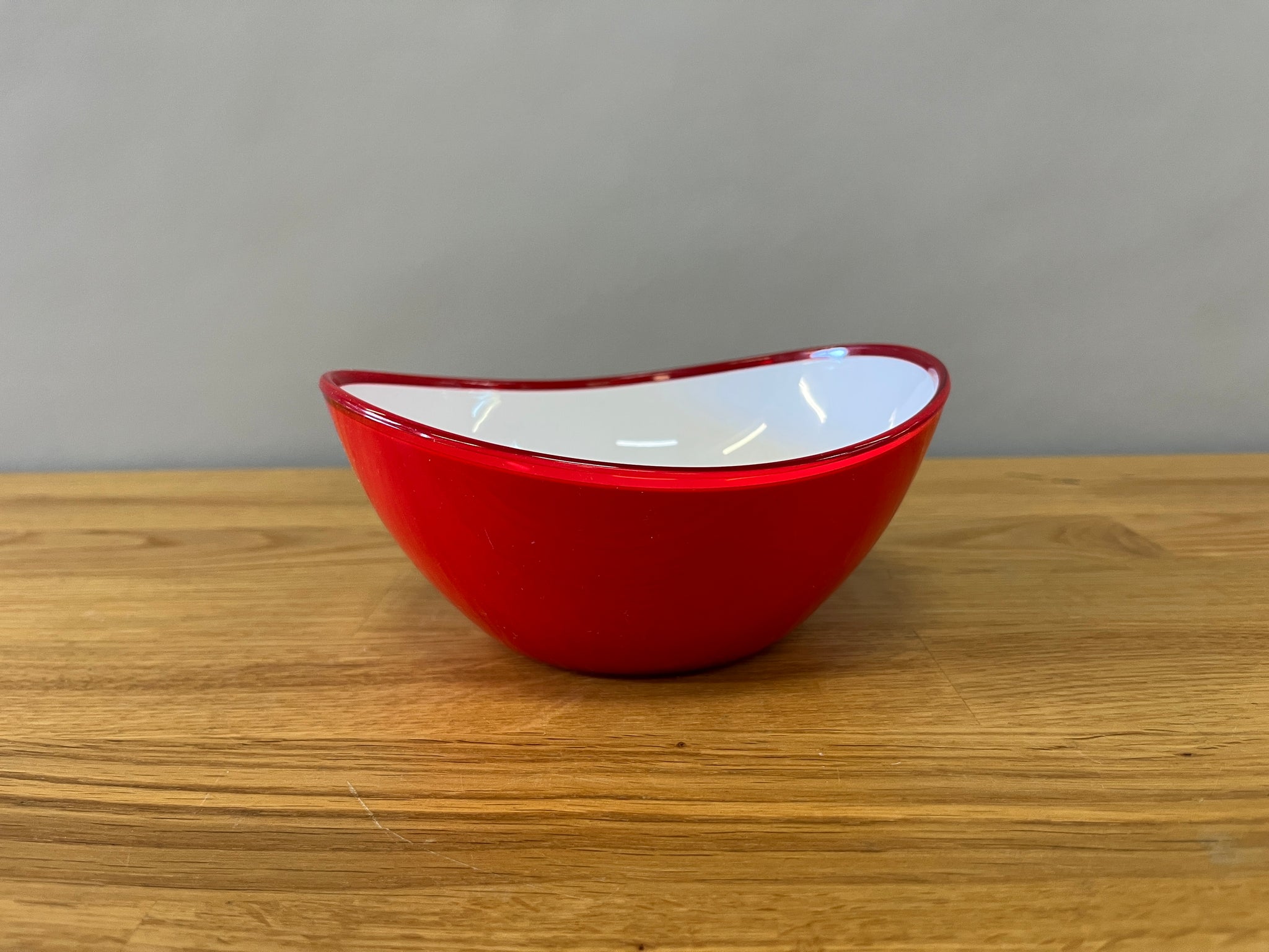 Red plastic asymmetrical bowl. Height approx 3", Diameter approx 6"