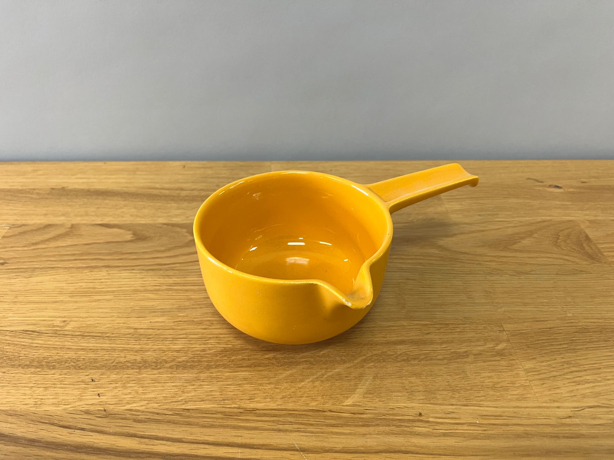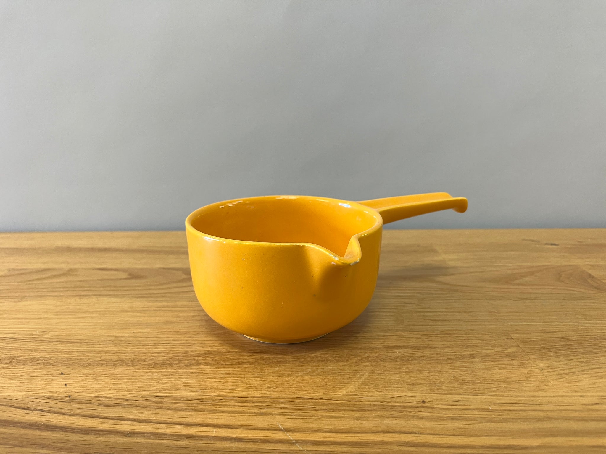 Yellow soup bowl with handle. Height 2.5", Width 7.5", Diameter approx 4.25"